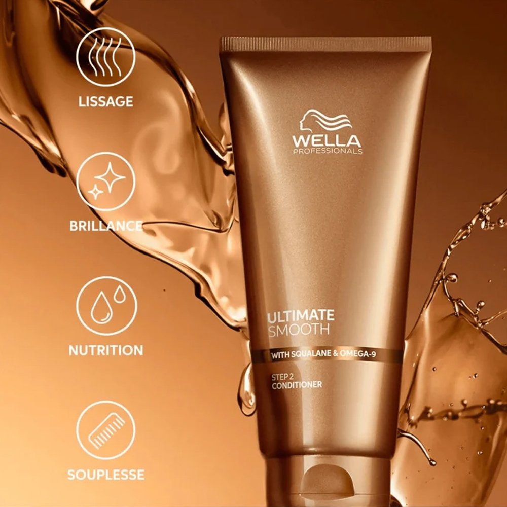 Experience salon-level smoothness with Wella Professionals Ultimate Smooth Step 2 Conditioner, enriched with Squalane and Omega-9 to deeply nourish and transform dry, frizzy, and unmanageable hair.
